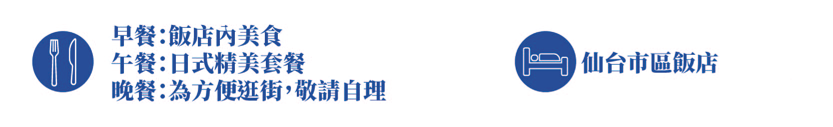 今日集合於台灣桃園國際機場,辦理出境手續後,搭乘豪華客機直飛東北~仙台空港,抵達後前往飯店休息
