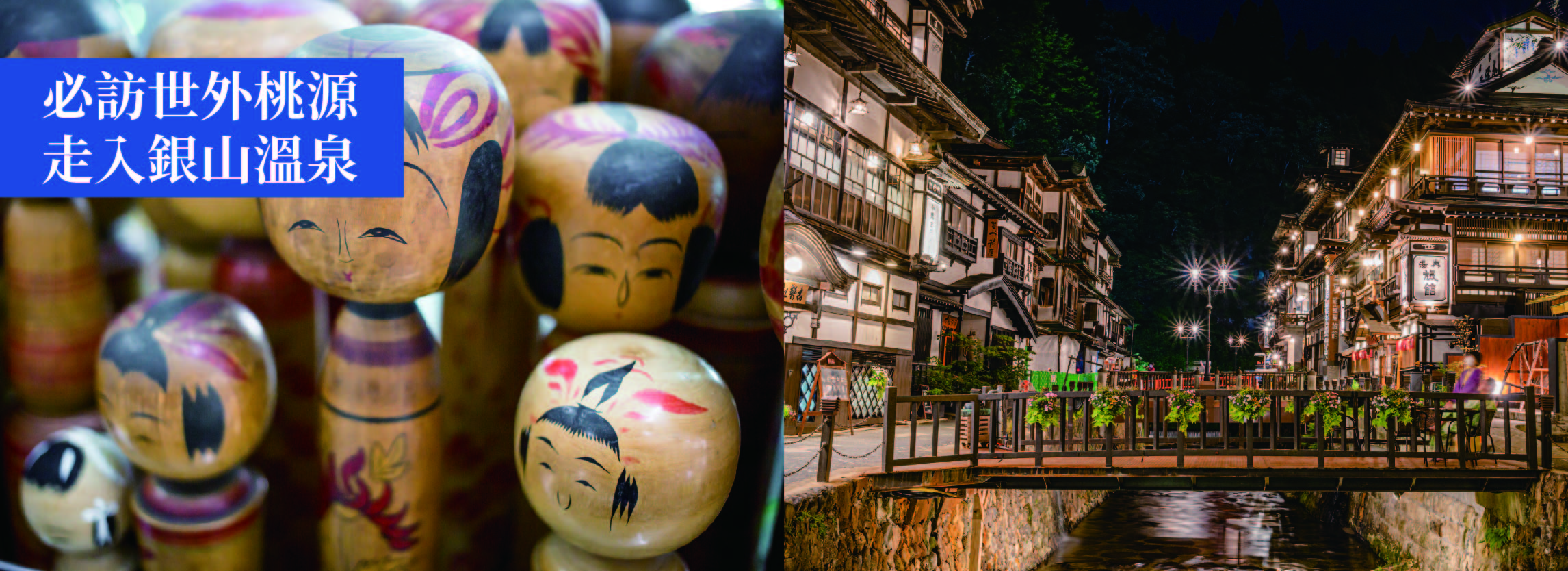 因銀礦產地而得名的銀山溫泉,已有400年的歷史。沿著銀山川溪谷而建,河岸兩旁保留完整大正至昭和時期的木造老式旅館、石坂道、小橋、瓦斯燈,搭配潺潺水流,氣氛寧靜,宛如世外桃源。