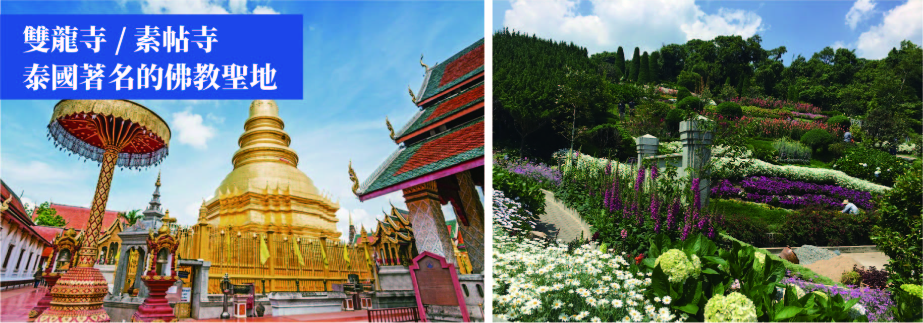 素帖山位於清邁古城西郊,海拔1053公尺,是泰國著名的佛教聖地,因到達寺廟前需先爬306階,階梯兩旁各有一條龍,所以又稱為「雙龍寺」。金黃色佛塔在藍天白雲的輝映之下閃耀著動人的色澤,是清邁最知名的佛寺之一,更可於觀景臺俯瞰清邁市區的美麗景緻。