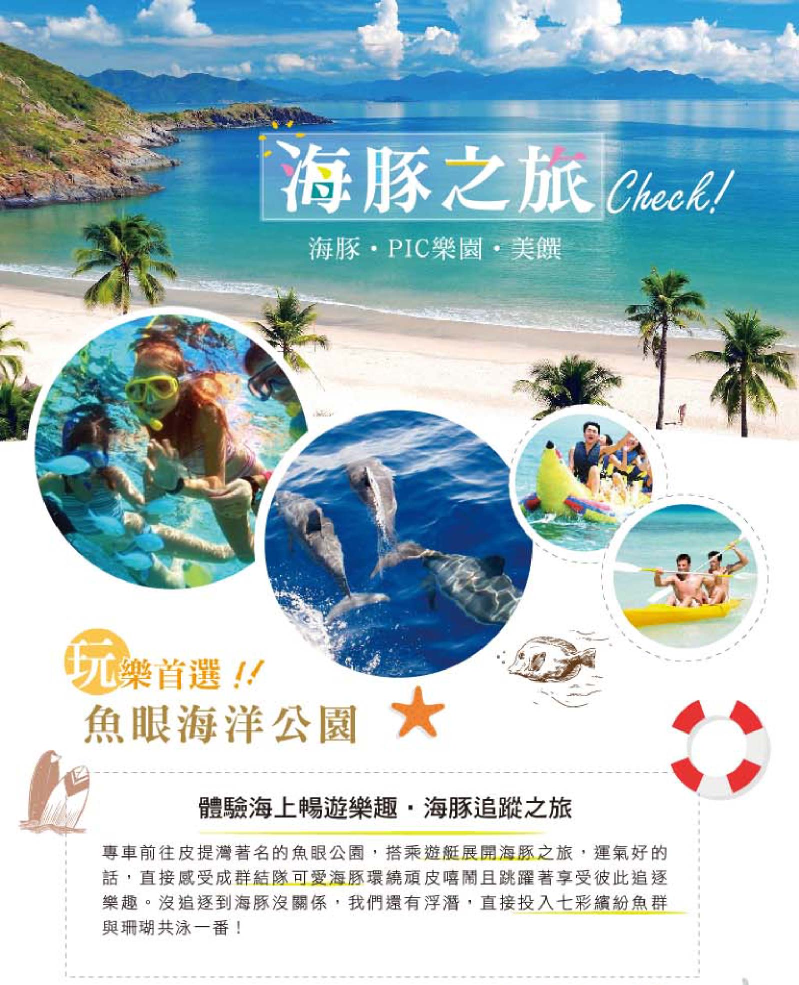 前往皮提灣著名的魚眼生態公園,搭乘遊艇觀賞這些愛玩耍的哺乳動物,沿著美麗海岸線尋找海豚棲息地後,觀察牠們嬉戲,從海中跳躍及旋轉。浮潛區擁有波動型景觀,超過200多種魚類棲息,耀眼的藍色海洋等待著您。晚餐安排六星DUSIT杜喜塔尼飯店內享用,進入餐廳映入眼簾的是180度俯瞰杜夢灣美景的視野、簡潔明亮擺設及國際美食自助盛宴推薦給您。