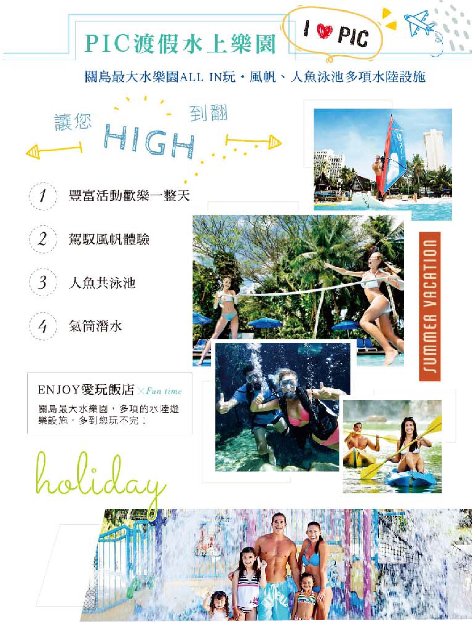 在國際PIC度假村內展開活動,悠哉地到海邊享受浮潛或到全世界僅三座的人魚共泳池與魚共舞;氣筒潛水是值得親身體驗的活動;來場網球或壁球、水上競走、水中韻律操、獨木舟、90米滑水道、射箭及高爾夫揮桿練習;您亦可於人工瀑布或海邊悠閒地划獨木舟;別忘露天水力按摩池讓您好好舒解一番!悠哉地到海邊享受浮潛或到全世界僅三座人魚共泳池與魚共舞;氣筒潛水是值得親身體驗活動;來場網球或壁球、水上競走、水中韻律操、獨木舟、90米滑水道、射箭及高爾夫揮桿練習;您亦可於人工瀑布或海邊悠閒地划獨木舟;別忘露天水力按摩池舒解一番!接著風帆、沙灘排球、水中角力拔河、水上籃排球、競走桌(撞)球,參加村內刻意安排趣味競賽,勝利者CLUB MATES還會頒份紀念品給您喔!