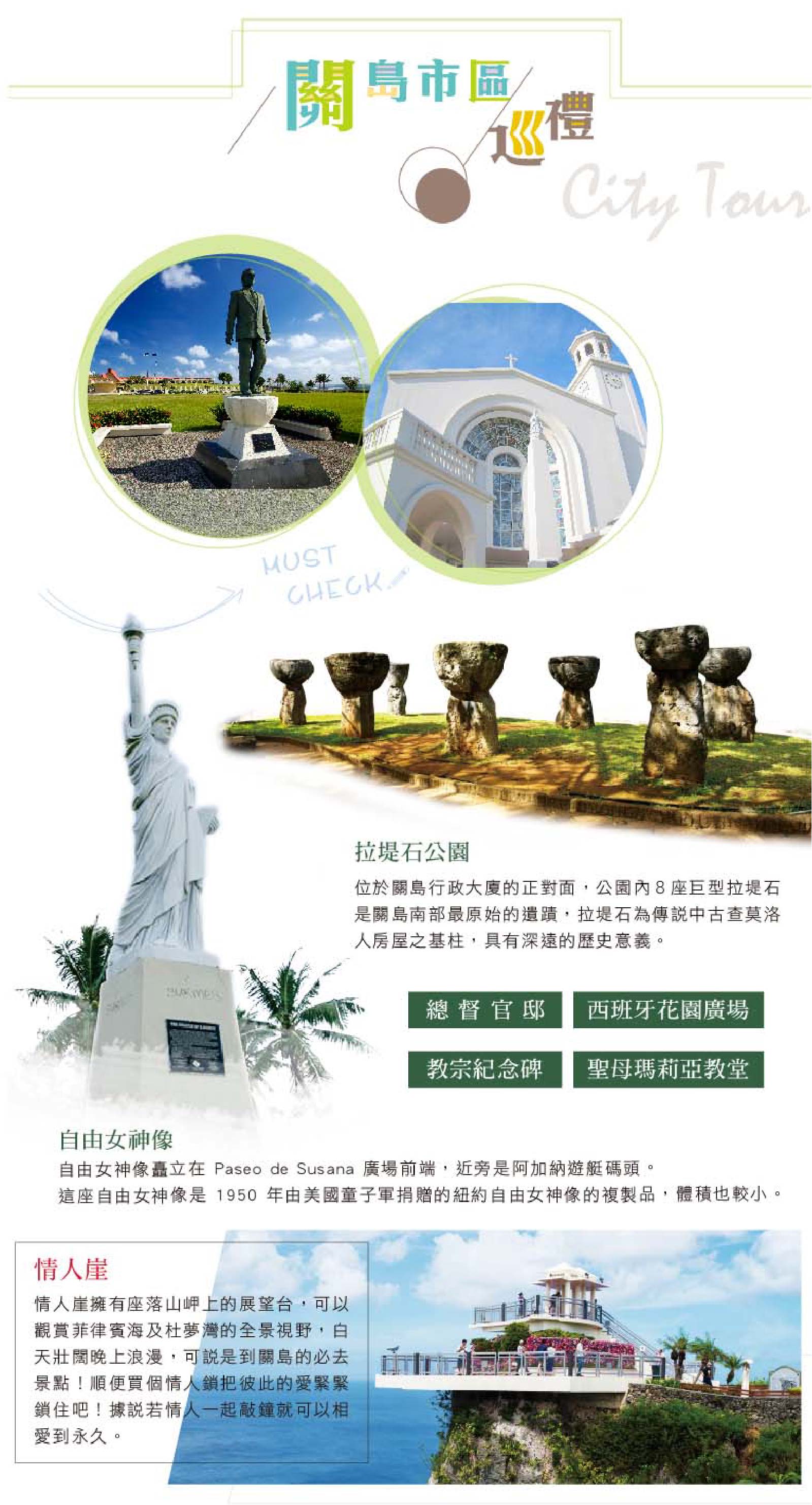 關島一天充滿著海水氣息,您可盡享飯店設施。之後展開市區觀光;首往關島總督府廣場及有著自由女神像照耀的戰爭紀念公園,造訪卡沙馬塔山下拉第石公園、尋幽西班牙廣場、聖母瑪利亞教堂與主教若望保祿二世教宗像。代表浪漫的情人崖,雙層展望台以絕佳角度眺望菲律賓海及杜夢灣,可買個小鎖把彼此心牢牢鎖上