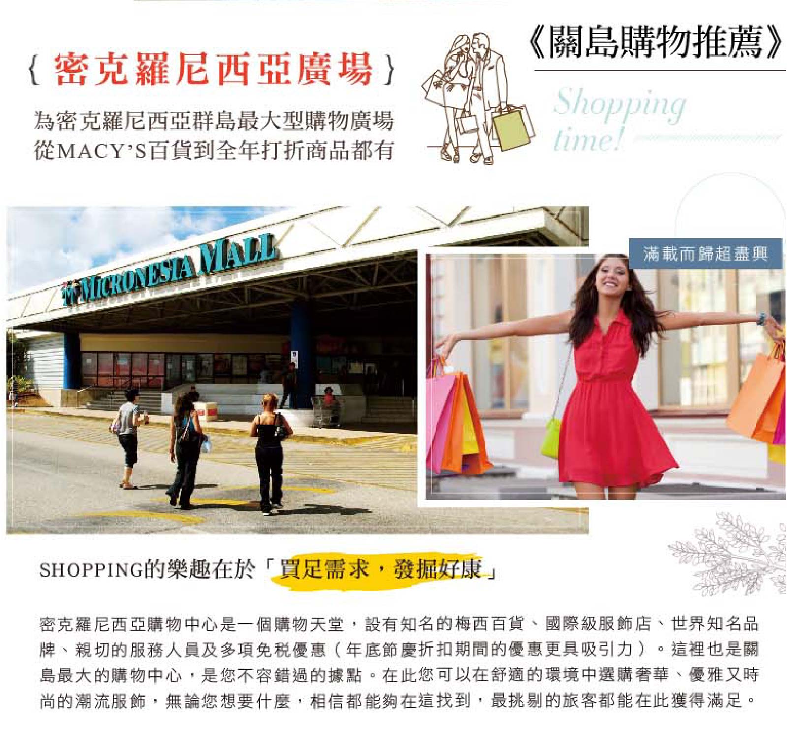 您可前往杜夢灣最熱鬧的歡樂島,有海底生態隧道及大型免稅店逛街購物,每樣都讓您流連忘返。或參加高空跳傘、越野車、實彈射擊等活動、晚上可自行體驗關島夜生活!